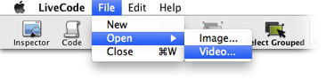 でメニューのグループを編集用に出して(Windowsだったらそのまま)、エディット・ツールでグループ「myMenu」をセレクトしたら、LiveCodeのアイコン・メニューの「Select Grouped」をクリックして、グループ内のオブジェクトが選べるようにします。次に「Editボタン」を選んで、スクリプト・エディターを開いてください。アプリケーション・ブラウザーでボタン・オブジェクトを選んで、スクリプト・エディターを開いても、もちろん良いです。
