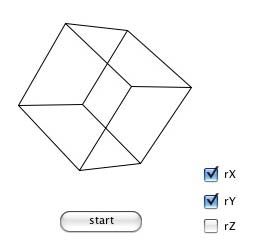 始めにAnimation Engineを開いて、start using stack "animationEngine" サンプルスタックは、下記をメッセージボックスにコピペしてリターンキーを go stack \ url "http://kenjikojima.com/livecode/ae/rotateIsoPoint.livecode" rotate3DPointとほぼ同じ機能ですが、パースペクティブのないアイソメトリック(isometric)図法で表現された、 ポリゴンのポイントを返します。図参照。 基本形体の XYZ座標は、右の表のようにae3dConvertToScreenで変換した立体を描くポリゴンのグループです。 基本形体に回転のアングルをパラメータで与えて、それぞれのポイントを得ます。 基本構文: rotateIsoPoint(基本形体のX座標, 基本形体のY座標, 基本形体のZ座標, \ Xの回転アングル,Yの回転アングル,Zの回転アングル) rotateIsoPoint(x,y,z,XRotation,Yrotation,Zrotation) サンプル: X軸だけの回転、 Y軸だけの回転、 Z軸だけの回転、その他複合の回転ができるように rX, rY, rZ のチェックボックスを作ります。 -- まず、ボタン「tStart」に、 カスタムプロパティにフィールド「tPoints」にある、 -- 基本形体の XYZ座標をセットします。 set the cPoints of btn "tStart" to field "tPoints" -- ボタン「スタート」のスクリプト -- ファンクション名が「 rotateIsoPoint」 に変わるだけで、 rotate3DPoint と同じです。 local lPoints,lAngleX,lAngleY,lAngleZ on mouseUp put the cPoints of me into lPoints -- カスタムプロパティのcPoints を基本形体のポイントリストにする if the flag of me is empty then set the flag of me to false set the flag of me to not the flag of me if the flag of me then -- XYZ の回転アングルを 0 に put 0 into lAngleX put 0 into lAngleY put 0 into lAngleZ set the label of me to "stop" rotateMe else set the label of me to "start" end if end mouseUp -- send rotate to me があるので、 Rev 3.0 では private command は使えません on rotateMe lock screen -- チェックボックスがハイライトになっていたら、アングルを 1 づつ加える if the hilite of btn "rX" then put lAngleX+1 into lAngleX end if if the hilite of btn "rY" then put lAngleY+1 into lAngleY end if if the hilite of btn "rZ" then put lAngleZ+1 into lAngleZ end if -- 基本形体のポイント数だけリピート repeat for each line theLine in lPoints if theLine is not empty then -- 回転アングルの数値の 3D ポイントを得て theLine2に入れる put rotateIsoPoint(item 1 of theLine,item 2 of theLine,item 3 of theLine,\ lAngleX,lAngleY,lAngleZ) into theLine2 -- 上の 3D ポイントを平面上のポイントに変換する put ae3DConvertToScreen(item 1 of theLine2,item 2 of theLine2,item 3 of theLine2,\ the loc of this cd,800)&cr after screenPoints else -- ひと筆描きのポリゴンのブレーク put cr&cr after screenPoints end if end repeat -- 得られた screenPointsでポリゴンを描く set the points of grc "threeD" to screenPoints wait 0 milliseconds with messages unlock screen if the flag of me then send rotateMe to me in 5 milliseconds end rotateMe